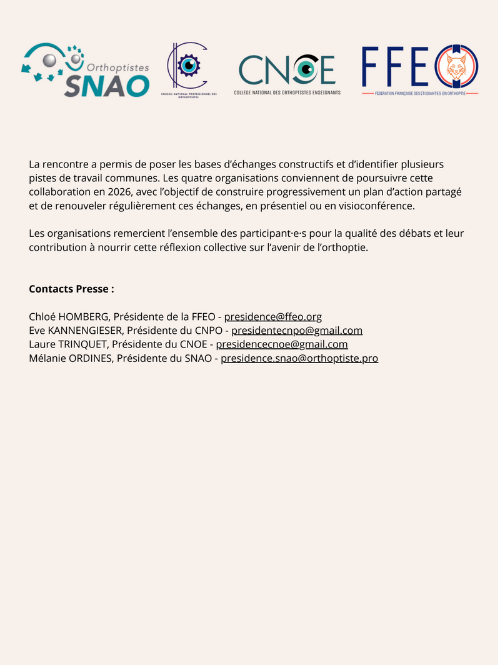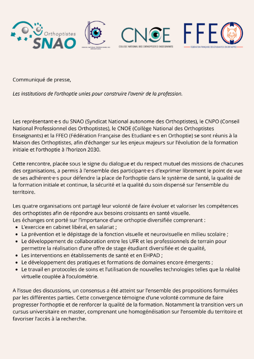 Les représentant·e·s du SNAO (Syndicat National autonome des Orthoptistes), le CNPO (Conseil National Professionnel des Orthoptistes), le CNOE (Collège National des Orthoptistes Enseignants) et la FFEO (Fédération Française des Etudiant·e·s en Orthoptie) se sont réunis à la Maison des Orthoptistes, afin d’échanger sur les enjeux majeurs sur l’évolution de la formation initiale et l’orthoptie à l’horizon 2030.