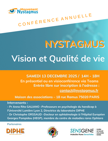 A l’occasion des 10 ans de l'association Mouvement Nystagmus, nous avons le plaisir de vous convier à une après-midi de conférences sur le thème "Nystagmus, vision et qualité de vie", le samedi 13 décembre 2025 de 14h à 18h.